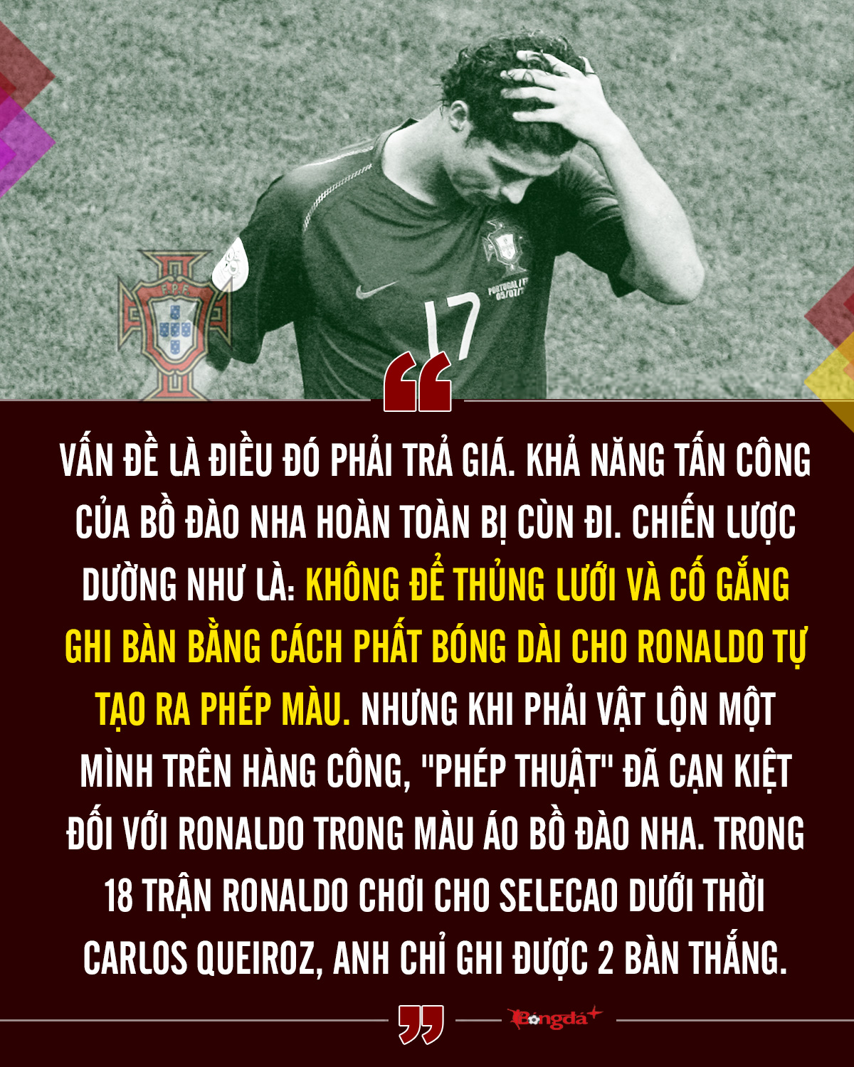 Ba trận đấu vòng loại World Cup đầu tiên mà Ronaldo chơi sau khi hồi phục chấn thương – gặp Thụy Điển sân nhà và sân khách, và sân nhà gặp Albania – đều kết thúc với tỷ số 0-0 và là dấu hiệu cho những gì sắp xảy ra. Queiroz đã biến Bồ Đào Nha thành một đội bóng đáng gờm từ góc độ phòng ngự. Selecao chỉ để thủng lưới vỏn vẹn 3 bàn trong 16 trận đấu trước World Cup 2010, và chỉ 1 bàn trong 4 trận tại giải đấu.