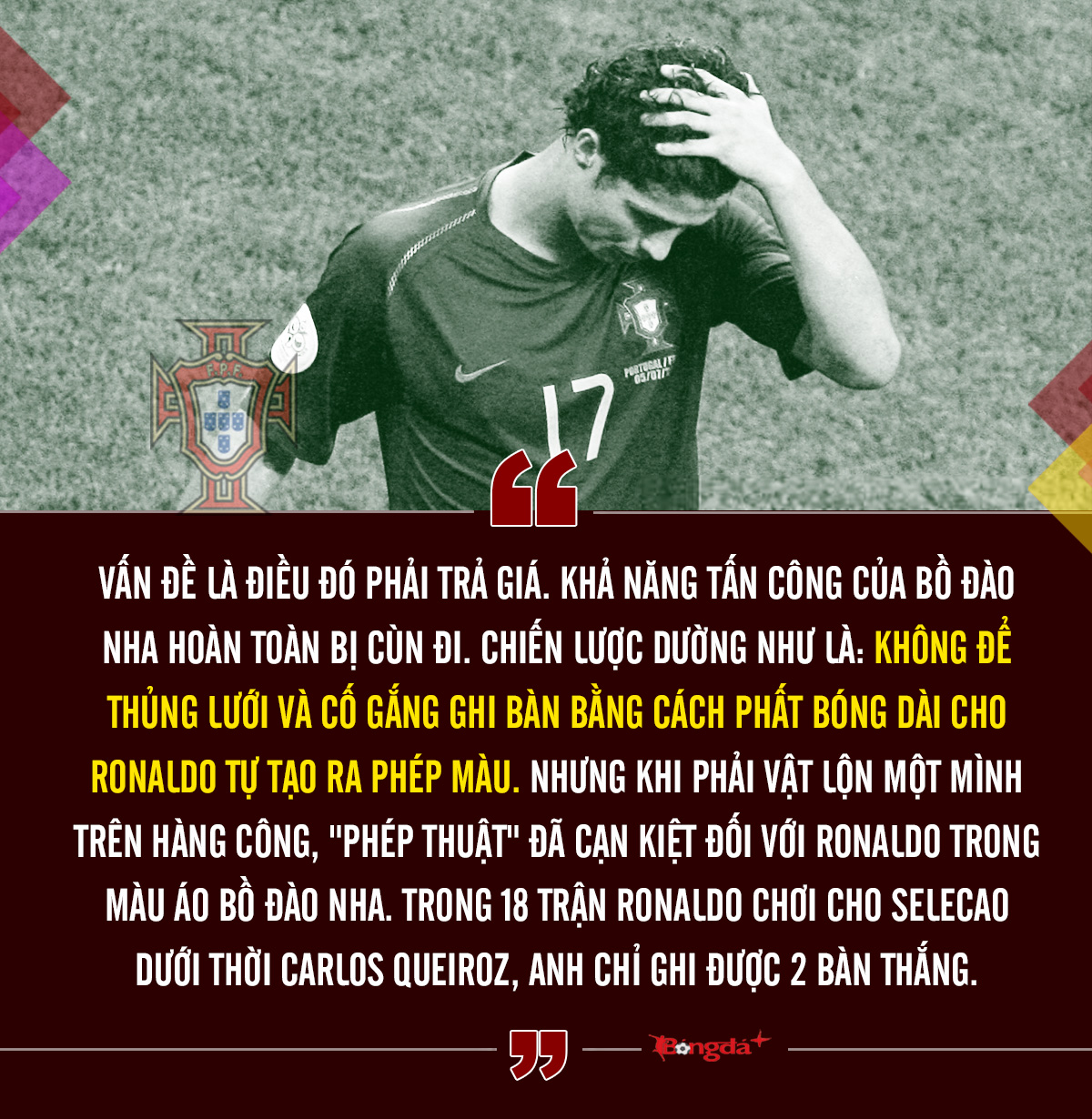 Nếu cần thêm minh họa rằng Selecao hoàn toàn phụ thuộc vào Ronaldo vào thời điểm này, thì điều đó đã xảy ra ngay tại giải đấu ở Brazil. Ronaldo đã thừa nhận rằng đó là một giải đấu mà anh lẽ ra không nên tham dự. Thật vậy, chấn thương viêm gân bánh chè ở đầu gối trái đã làm suy giảm thể trạng của Ronaldo vào cuối mùa giải CLB, nhưng với việc Real Madrid lọt vào chung kết Champions League – Ronaldo ghi bàn trong chiến thắng 4-1 trước đối thủ cùng thành phố Atletico ở Lisbon – đội trưởng Bồ Đào Nha đã không cho cơ thể mình cơ hội nghỉ ngơi. Bất chấp lời cầu xin của Real để anh không tham dự giải đấu, Ronaldo vẫn khẳng định sẽ dẫn dắt đất nước của mình tại Brazil.