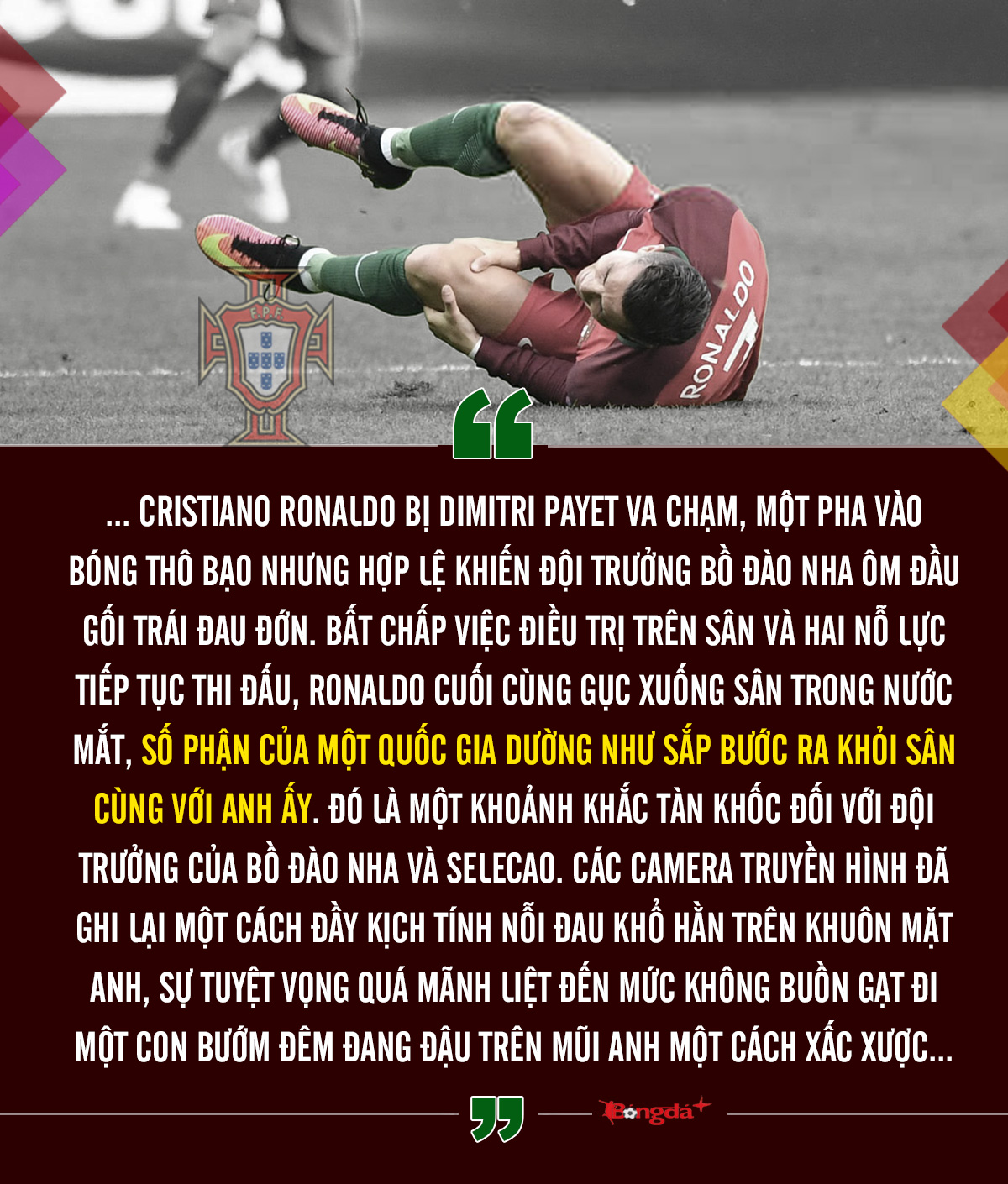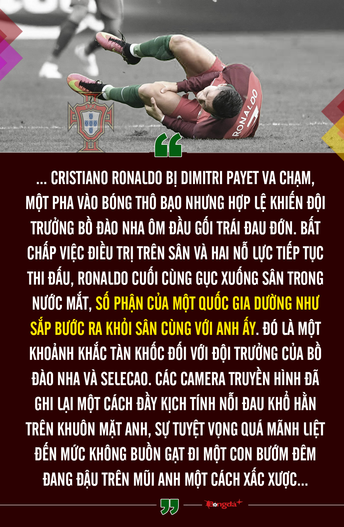 Giống như tất cả những người vĩ đại, Ronaldo không bận tâm đến vận rủi của mình, cảm thấy rằng anh vẫn có thể hữu ích cho đội. Trong khu vực kỹ thuật sau trận đấu, Cédric đã tiết lộ Ronaldo đã có một bài phát biểu đầy khích lệ trong giờ nghỉ giải lao, nói với đội rằng họ sẽ chiến thắng. Trong hiệp phụ, anh đứng cạnh Fernando Santos như một HLV phụ đầy ngẫu hứng, thúc giục, dỗ dành và động viên đồng đội của mình cống hiến mọi nỗ lực cuối cùng trong đêm Paris nổi tiếng. Và sau đó, niềm vui của anh là không thể kìm nén.