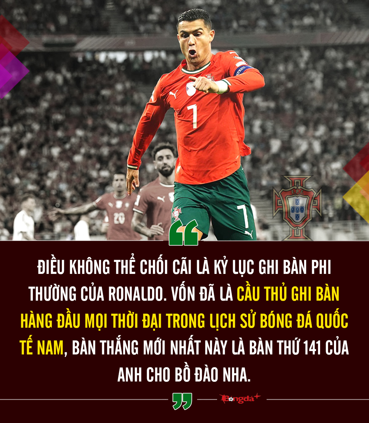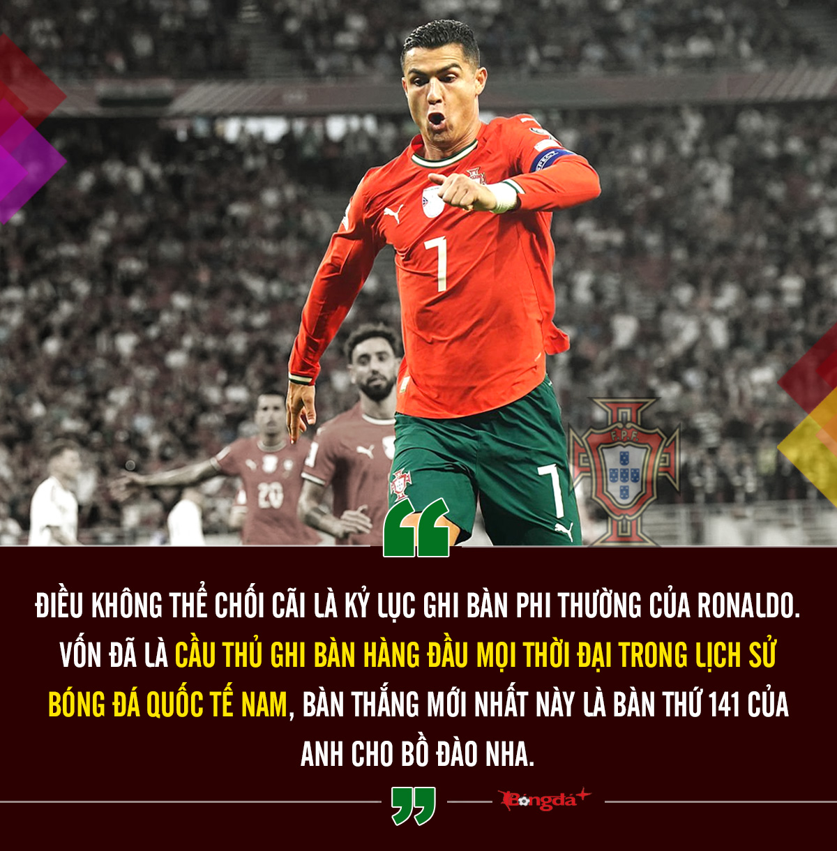 Tuy nhiên, điều không thể chối cãi là kỷ lục ghi bàn phi thường của Ronaldo. Vốn đã là cầu thủ ghi bàn hàng đầu mọi thời đại trong lịch sử bóng đá quốc tế nam, bàn thắng mới nhất này là bàn thứ 141 của anh cho Bồ Đào Nha.