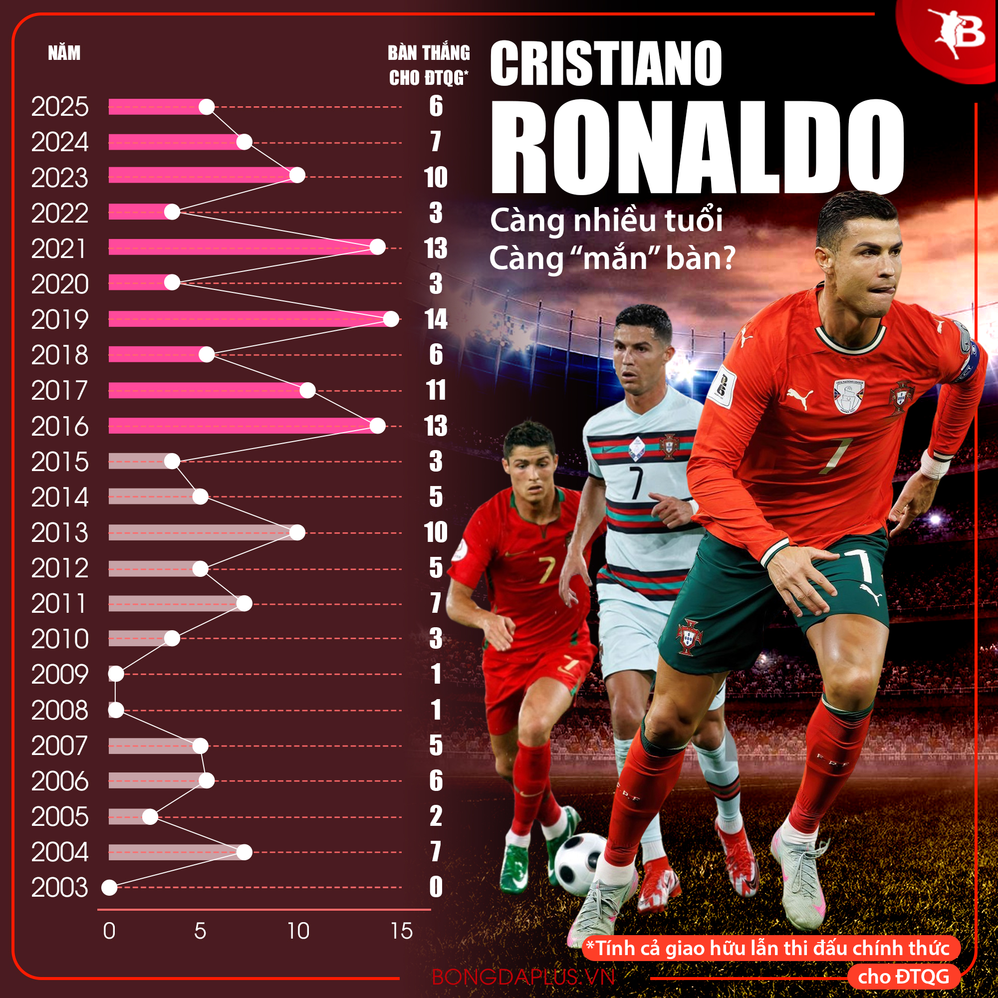 Bất chấp sự không chắc chắn liên tục về tương lai quốc tế của anh, khả năng ghi bàn của Cristiano Ronaldo vẫn không hề suy giảm. Tổng số bàn thắng đáng kinh ngạc của anh sau tuổi 30 làm nổi bật sự từ chối của anh trong việc mờ nhạt dần tại ĐT Bồ Đào Nha.