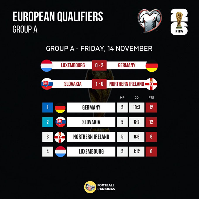 Đức hiện vẫn đứng đầu bảng A với 12 điểm sau 5 trận. Tuy nhiên, họ đang bằng điểm với Slovakia và chỉ xếp trên nhờ chỉ số phụ. Cỗ xe tăng vẫn phải chờ tới lượt trận cuối mới biết mình có vé chính thức hay phải đá play-off. Ở lượt trận cuối, Đức và Slovakia sẽ đối đầu nhau để tranh ngôi đầu bảng.
