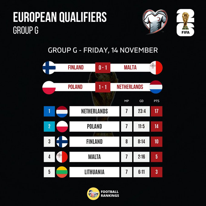 Hà Lan vẫn đứng đầu bảng G với 17 điểm sau 7 trận, hơn Ba Lan 3 điểm và hiệu số cách biệt rất lớn (19 so với 6). Trừ khi có điều thần kỳ xảy ra thì Hà Lan mới mất ngôi đầu vào tay Ba Lan.