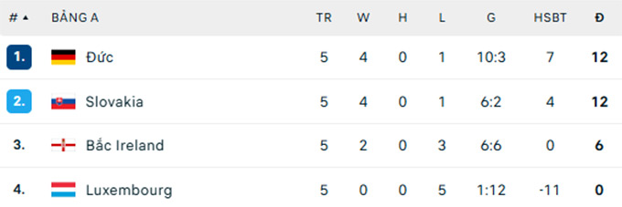 Đức và Slovakia cùng có 12 điểm, biến lượt cuối thành trận chung kết đúng nghĩa khi hai đội đối đầu trực tiếp tranh ngôi đầu. Đội thắng sẽ kết thúc với 15 điểm và đi thẳng đến World Cup. Nếu hòa, Đức lợi thế nhờ hiệu số. Bắc Ireland (6 điểm) đã hết cửa, còn Luxembourg chưa có điểm nào. Mọi phép tính đều chỉ ra một điều: màn so tài Đức vs Slovakia quyết định tất cả.