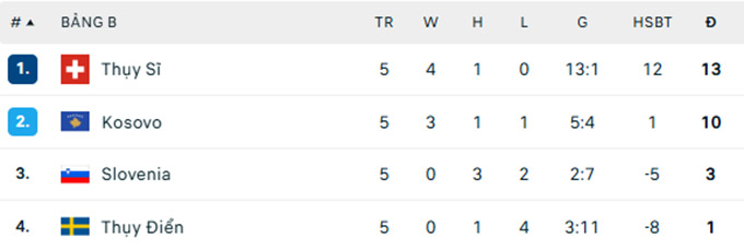 Thụy Sĩ dẫn đầu với 13 điểm và sở hữu hiệu số vượt trội trước lượt cuối (+12 so với +1 của đội nhì bảng). Kosovo đứng thứ hai với 10 điểm và có cơ hội cuối để lật ngược thế cờ trong trận đối đầu trực tiếp. Slovenia (3 điểm) và Thụy Điển (1 điểm) đã bị loại. Dù Kosovo vẫn còn hy vọng về mặt lý thuyết, các con số cho thấy Thụy Sĩ đang có đường tới World Cup rất rộng mở.