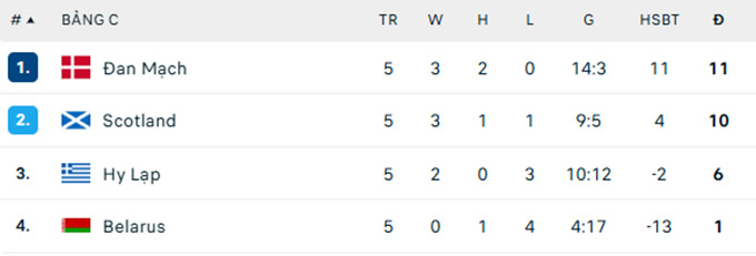 Đan Mạch dẫn đầu với 11 điểm, ngay sau là Scotland với 10 điểm, trong khi Hy Lạp (6) và Belarus (1) đã hết cửa. Lượt cuối chứng kiến trận quyết đấu trực tiếp trên đất Scotland: ai thắng sẽ lấy vé đi World Cup. Chỉ cách nhau 1 điểm, bảng C hứa hẹn một màn hạ màn kịch tính đến phút cuối.
