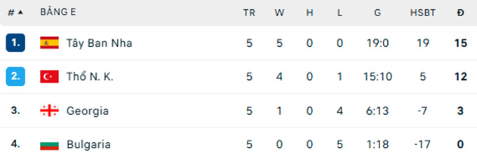 Tây Ban Nha dẫn đầu với 15 điểm và bước vào trận cuối gặp Thổ Nhĩ Kỳ với lợi thế gần như chắc chắn nhờ chênh lệch hiệu số lên tới +7. Thổ Nhĩ Kỳ (12 điểm) đã chắc suất play-off, còn Georgia (3) và Bulgaria (0) bị loại. Nhiều khả năng lượt cuối chỉ còn là thủ tục để Tây Ban Nha chính thức sở hữu ngôi đầu.