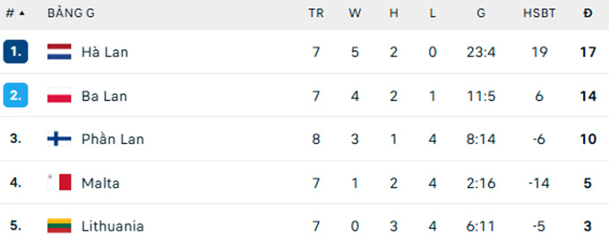 Hà Lan dẫn đầu với 17 điểm và dù chưa chắc suất trên lý thuyết, nhưng hiệu số vượt trội giúp họ gần như cầm chắc vé. Ba Lan đứng sau với 14 điểm, còn Phần Lan (10), Malta (5) và Lithuania (3) không còn cơ hội. Trước lượt cuối, mọi dấu hiệu cho thấy Hà Lan chỉ cần hoàn tất nốt một công việc gần như đã xong.