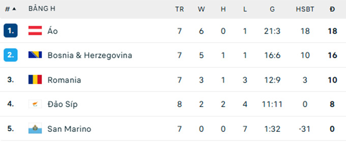 Cuộc đua giành vị trí đầu bảng sẽ được định đoạt ở lượt cuối, khi Áo (18 điểm) và Bosnia (16 điểm) gặp nhau trực tiếp để tranh vé đi thẳng World Cup. Romania (10), Đảo Síp (8) và San Marino (0) đã bị loại khỏi cuộc đua. Áo vs Bosnia sẽ là trận đấu phân ngôi đầu đúng nghĩa.