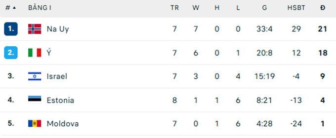 Na Uy dẫn đầu với 21 điểm và có lợi thế gần như không thể san lấp. Italia đứng sau với 18 điểm, vẫn có thể bắt kịp về điểm số, nhưng khoảng cách hiệu số quá lớn (+29 so với +12) khiến cơ hội vượt lên là vô cùng mong manh. Israel (9), Estonia (4) và Moldova (1) đã bị loại. Dù trận cuối giữa Na Uy và Italia rất đáng chú ý, mọi phép tính cho thấy Na Uy gần như chắc chắn giữ ngôi đầu, trừ khi xảy ra một cơn đại địa chấn.