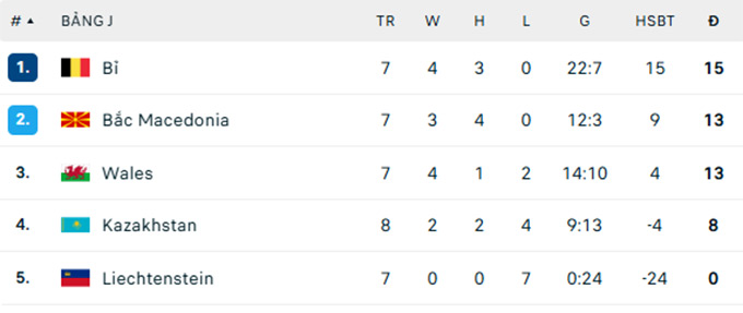 Bỉ dẫn đầu với 15 điểm và có trận cuối rất dễ thở khi gặp Liechtenstein – đội chưa có điểm nào. Khả năng Bỉ giữ ngôi đầu gần như chắc chắn. Ở phía sau, Bắc Macedonia và Wales cùng có 13 điểm và sẽ quyết chiến để giành suất play-off. Kazakhstan (8) và Liechtenstein (0) đã hết hy vọng. Mọi ánh mắt đổ dồn vào trận Bắc Macedonia vs Wales để xác định đội nhì bảng.
