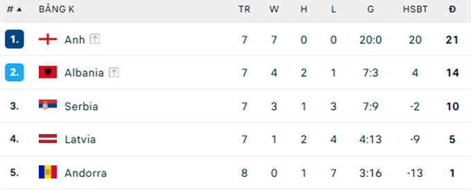 Không còn bất ngờ nào: Anh dẫn đầu với 21 điểm và đã chắc suất, Albania (14 điểm) cũng đã chắc suất play-off. Serbia (10), Latvia (5) và Andorra (1) bị loại. Lượt cuối chỉ còn mang tính thủ tục trong một bảng đấu đã an bài sớm.