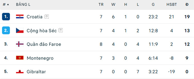 Tương tự bảng K, không còn nhiều điều để nói về bảng đấu này. Croatia dẫn đầu với 19 điểm và đã giành vé dự World Cup, còn CH Séc (13 điểm) chắc suất play-off. Quần đảo Faroe kết thúc với 12 điểm nhưng không thể vượt CH Séc, khi họ đã đá xong 8 trận. Montenegro (9) và Gibraltar (5) đã hết cửa. Bảng L khép lại mà không còn điều gì phải chờ đợi.