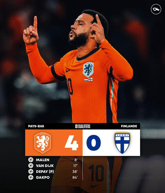 Ở trận đấu giữa Hà Lan và Phần Lan, Cơn lốc cam sớm có bàn mở tỷ số ngay phút thứ 8 sau khi Memphis Depay kiến tạo cho Malen dứt điểm hoàn hảo.