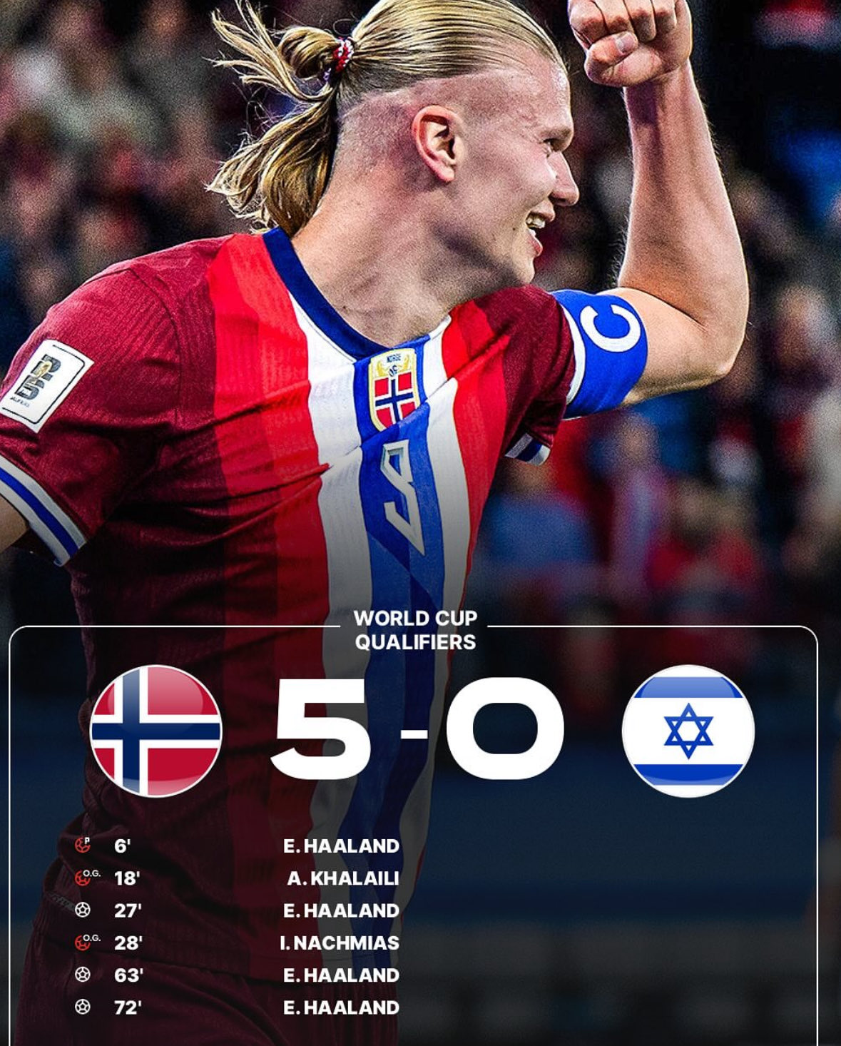 Trước đôi thủ chỉ là Israel, Na Uy với phong độ xuất sắc của Haaland với cú hat-trick ấn tượng đã dễ dàng đánh bại đối thủ với tỷ số 5-0. Như vậy, Haaland đã ghi 51 bàn chỉ sau 46 lần ra sân cho tuyển quốc gia.