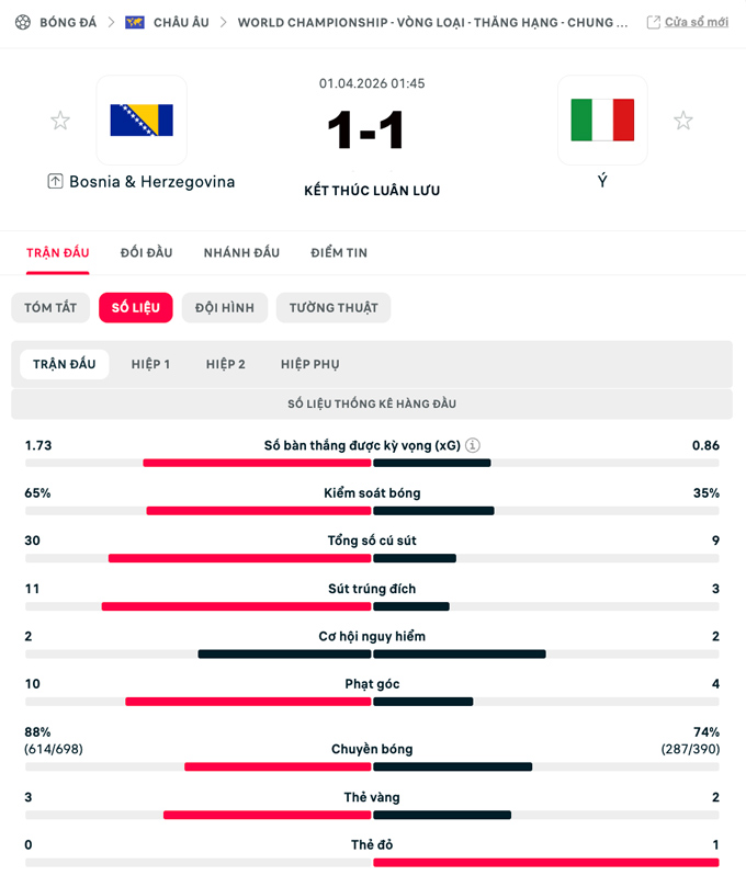 Trên chấm 11m, bi kịch gọi tên Italia. Francesco Pio Esposito đá hỏng ngay lượt đầu tiên khi sút vọt xà, còn Bryan Cristante đưa bóng dội xà ngang. Ngược lại, Bosnia thực hiện hoàn hảo các lượt sút, khép lại chiến thắng 4-1 để giành vé dự World Cup 2026.