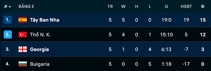 Ngược lại, Tây Ban Nha đã toàn thắng cả 5 trận tại bảng E, ghi tổng cộng 19 bàn và không để thủng lưới lần nào. Dù chưa chính thức có vé, nhưng hiệu số vượt trội giúp “Bò tót” gần như không thể bị Thổ Nhĩ Kỳ vượt qua. Tây Ban Nha sẽ tiếp đón chính Thổ Nhĩ Kỳ ở lượt trận cuối và khoảng cách giữa hai đội là 3 điểm.