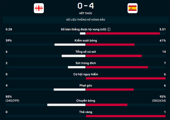 Gặp áp lực lớn từ Tây Ban Nha, Gocholeishvili để bóng chạm tay sau cú dứt điểm của Ferran Torres, mang về quả phạt đền sớm cho Tây Ban Nha. Mikel Oyarzabal lạnh lùng thực hiện thành công, ghi bàn thứ 20 cho tuyển Tây Ban Nha và là bàn thắng thứ 100 của “Bò tót” dưới triều đại HLV Luis De La Fuente.
