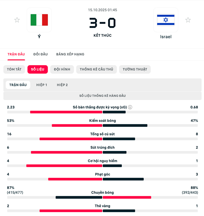 Tuy nhiên, hiệp 1 lại chứng kiến màn trình diễn thiếu gắn kết của thầy trò HLV Gennaro Gattuso. Hàng tiền vệ vận hành rời rạc, trong khi hàng thủ nhiều lần bị Israel khai thác bằng những pha pressing tầm cao.