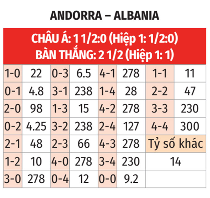 - Albania thua hiệp 1 theo châu Á: Albania thua hiệp 1 theo châu Á ở 3/4 trận gần nhất. Ở chiều ngược lại, Andorra đang có 3 trận thắng hiệp 1 theo châu Á liên tiếp (không kể giao hữu).