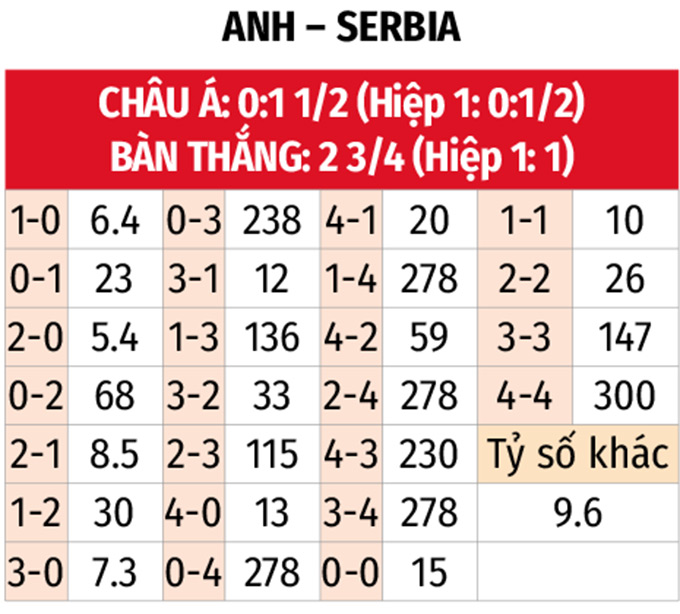 - Tối đa 4 góc hiệp 1: Lịch sử đối đầu chứng kiến cả 2 trận gặp nhau gần nhất giữa đôi bên đều kết thúc hiệp thi đấu đầu tiên với tối đa 4 quả phạt góc trong hiệp 1. Kịch bản này hoàn toàn có thể tái hiện ở trận đấu này, khi Anh vốn không phải cái tên quá mạnh ở khoản "cày góc" với 4/5 trận gần đây có không quá 4 góc trước giờ nghỉ. Với Serbia, 8/10 trận vừa qua của đội khách cũng khép lại 45 phút đầu tiên với nhiều nhất 4 lần bóng được đặt ở bốn cột góc cuối sân.