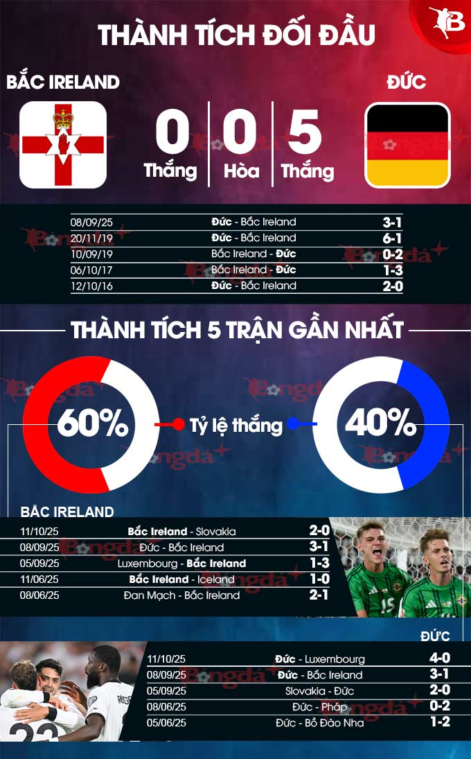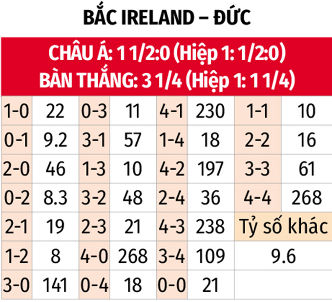 - Từ 3 bàn thắng trở lên: 5/7 trận gần đây của Đức cùng 4/6 trận vừa qua của Bắc Ireland đều xuất hiện từ 3 bàn thắng trở lên. Kịch bản tương tự cũng diễn ra ở 3/4 trận đối đầu gần nhất giữa hai đội.