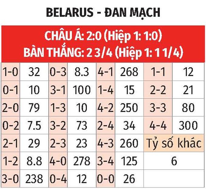 - Lưới rung 25 phút cuối: 3/5 trận gần đây của Belarus có bàn thắng từ phút 65 trở đi. Chưa hết, 4/5 trận sân nhà vừa qua của Đan Mạch cũng chung kịch bản.