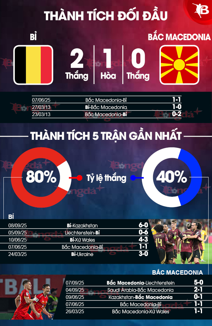 - Hai đội cùng ghi bàn: Bỉ và Bắc Macedonia đã thành công trong việc ghi bàn ở 5 trận gần nhất. Bên cạnh đó, Bỉ cũng ghi bàn ở 4/5 trận chính thức gần nhất trên sân nhà, còn Bắc Macedonia làm được điều đó ở 5 trận sân khách chính thức vừa qua. Với xu hướng như vậy, khả năng cao hai đội sẽ cùng tìm được đường vào khung thành của nhau.