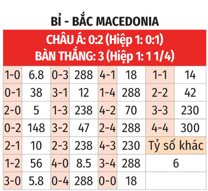 - Lưới rung 25 phút cuối: 5 trận gần đây của Bỉ có bàn thắng từ phút 65 trở đi. Chưa hết, 3/5 trận vừa qua của Bắc Macedonia cũng chung kịch bản.