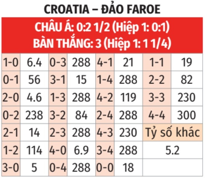 - Croatia thua theo châu Á: Croatia thua theo châu Á ở 3/4 trận gần đây tại vòng loại World Cup và thua theo châu Á ở lần đối đầu mới nhất với Đảo Faroe. Đảo Faroe thắng 3, hòa 1/4 trận vừa qua theo châu Á.