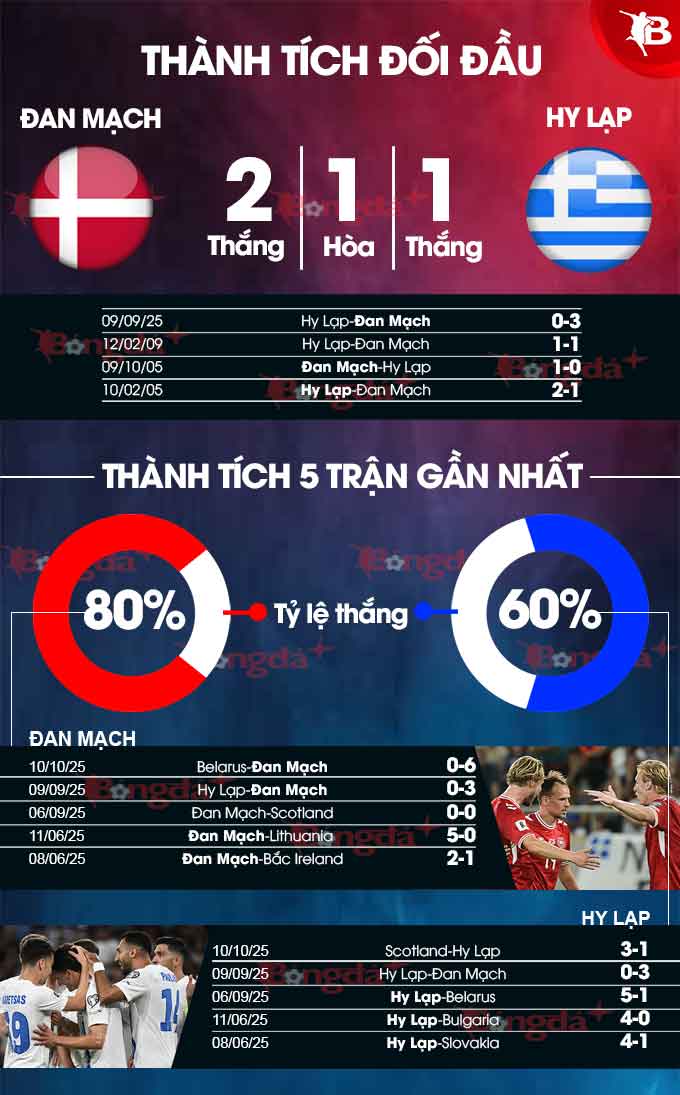 - Tối thiểu 3 bàn cả trận: 3/4 trận đấu gần đây của Đan Mạch đều xuất hiện từ 3 bàn thắng trở lên. Tình trạng tương tự xảy ra ở 6 trận vừa qua của Hy Lạp.