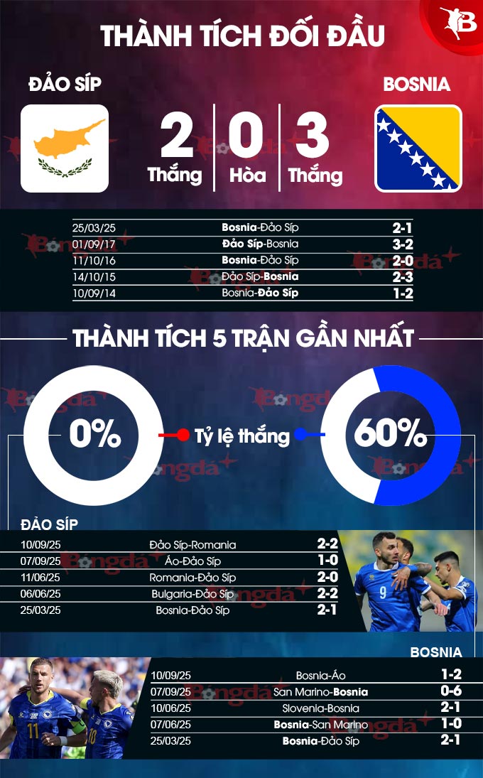 - Bùng nổ bàn thắng: 4/5 trận gần đây của Bosnia cùng trận ra sân gần nhất của Đảo Síp đều có từ 3 bàn thắng trở lên. Lịch sử đối đầu ghi nhận 4/5 trận gặp nhau gần nhất giữa hai đội cũng có tối thiểu 3 pha làm bàn.