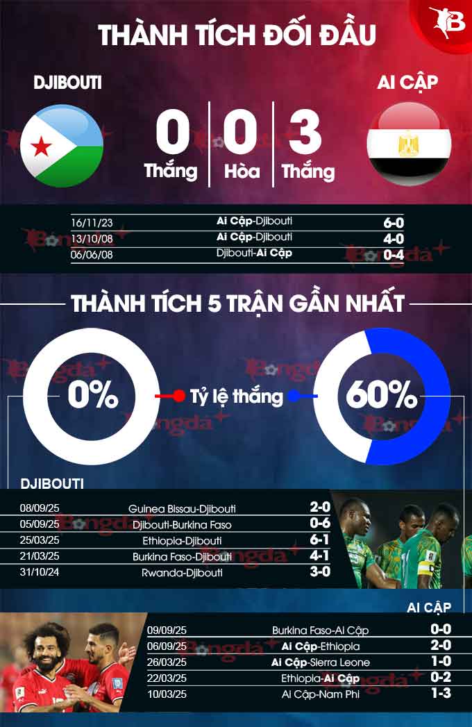 Ba cuộc đối đầu trong quá khứ, Djibouti thua cả ba, dù đá sân trung lập hay sân khách. Điều đáng nói là họ thủng lưới tới 14 lần mà không ghi nổi 1 bàn thắng nào. Trước cuộc đón tiếp Ai Cập lần này, Djibouti cũng đang có phong độ không tốt khi thua cả 5 trận gần đây.