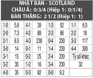 SCOTLAND THẮNG KÈO CHÂU Á: Scotland thắng kèo châu Á 4/6 trận đấu gần đây. Nhật Bản thua kèo châu Á 3/5 trận đấu gần đây. Trận đấu này Scotland có nhiều hi vọng rằng ít nhất mình cũng sẽ giành được điểm trước đối thủ Nhật Bản.