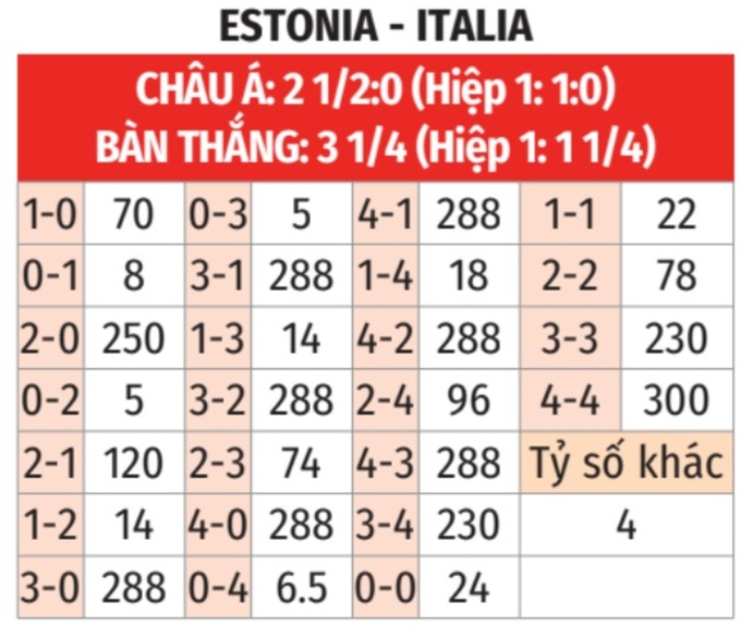 - Tối thiểu 2 bàn hiệp 1: 2/3 lần đối đầu giữa 2 đội gần đây đều có từ 2 bàn thắng trở lên trong hiệp 1. 8/10 trận sân nhà gần đây của Estonia tại các giải chính thức và 8/10 trận sân khách gần nhất của Italia xảy ra tình trạng tương tự.