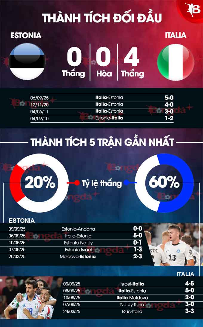 Phải nhấn mạnh rằng, Estonia chưa bao giờ xứng tầm đối thủ với ĐT Italia. Trong 4 lần chạm trán gần đây, cứ trận sau họ lại phải nhận thất bại với nhiều bàn thua hơn trận trước. Cụ thể, Italia lần lượt thắng 2-1, 3-0, 4-0, rồi gần đây nhất là 5-0. Tổng cộng trong 4 trận đấu đó, đội bóng thiên thanh ghi vào lưới của Estonia tới 14 bàn, nghĩa là trung bình mỗi trận ghi gần 4 bàn thắng.