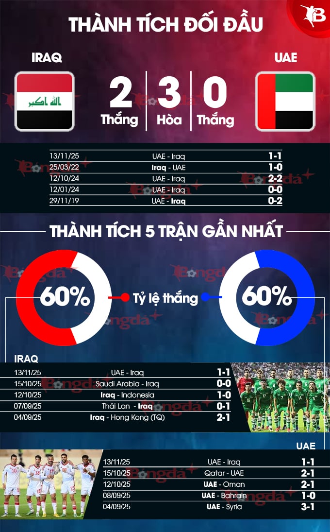 • Hai đội đều có bàn thắng. 4/5 trận gần nhất của Iraq có bàn thắng. 4/5 trận gần nhất của UAE có bàn thắng. 2/3 trận đối đầu gần nhất đều có bàn thắng.