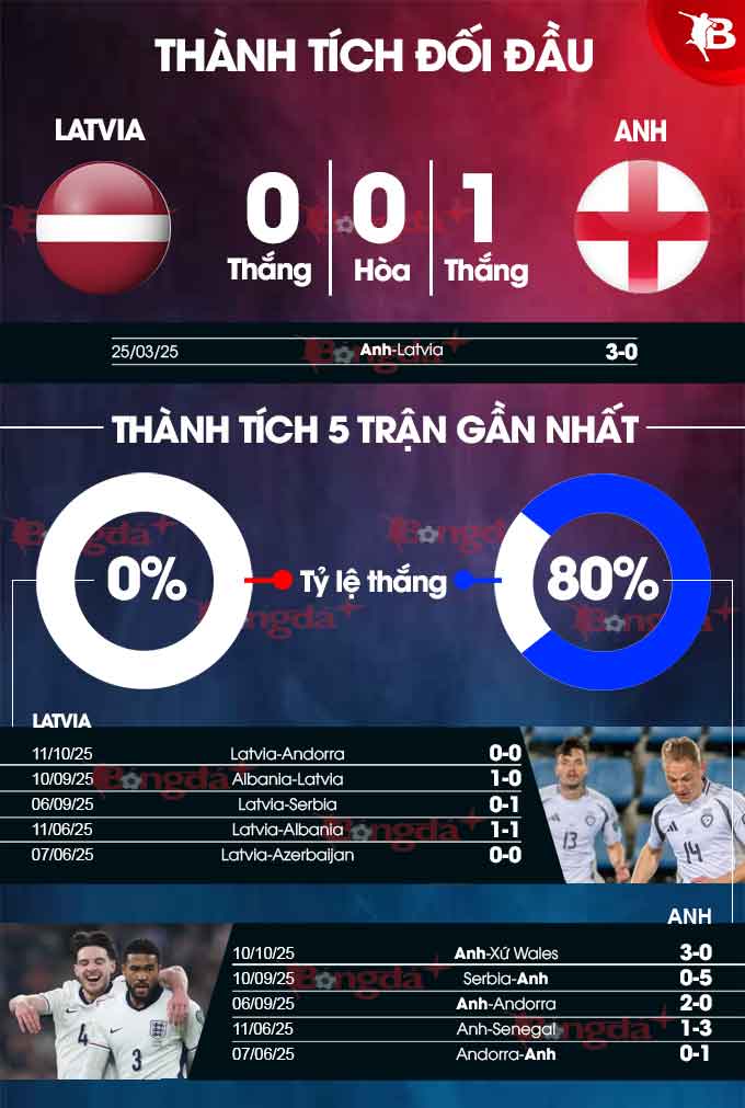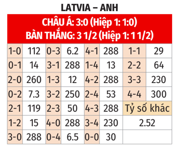 - Lẻ bàn thắng: 6/9 trận gần nhất của cả Lavita và Anh đều khép lại với tổng bàn thắng là lẻ. Ngoài ra, 5/8 trận sân nhà vừa qua của Latvia cũng kết thúc với tổng bàn thắng không chia hết cho 2.
