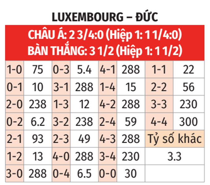 - Luxembourg thắng hiệp 1 theo châu Á: Trong 6 trận gần đây Đức thua hiệp 1 theo châu Á tới 4 lần. Đá vưới Luxembourg thắng theo châu Á ở 4/5 trận vừa qua, đội chủ nhà không phải là sự lựa chọn đáng tin cậy trước giờ nghỉ.