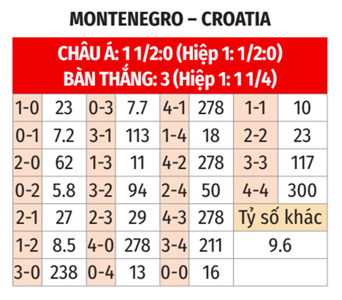 - Chẵn bàn thắng: 8/11 trận gần nhất của Montenegro và 7/10 trận vừa qua của Croatia đều khép lại với tổng bàn thắng là chẵn. Ngoài ra, 7/10 trận sân nhà gần đây của Montenegro cũng có tổng bàn thắng không chia hết cho 2. Trận này khó có ngoại lệ.