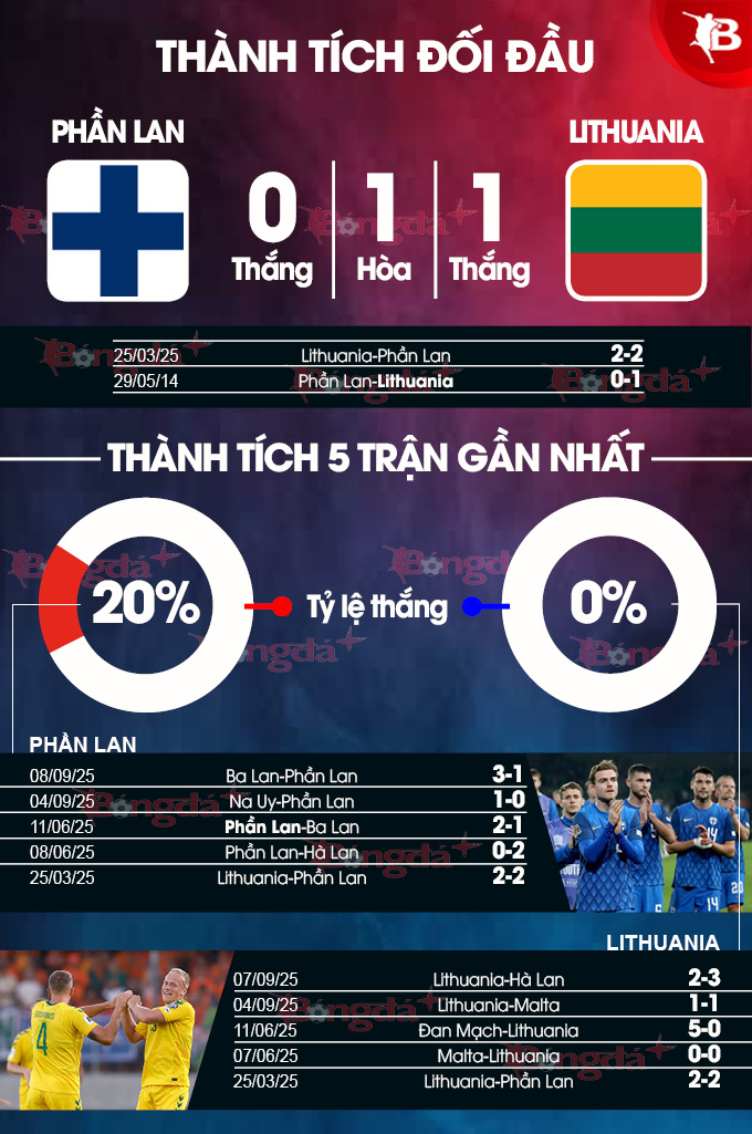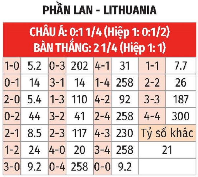- Chẵn bàn thắng: 4/7 trận gần đây của Phần Lan cùng 3/5 trận vừa qua của Lithuania đều có tổng bàn thắng là chẵn. Kịch bản chẵn bàn thắng cũng diễn ra ở trận đối đầu lượt đi hồi tháng 3 vừa qua.