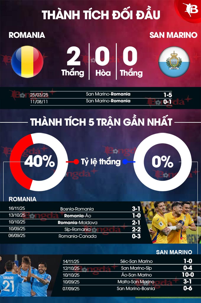 - Tối thiểu 2 bàn hiệp 1: 3/4 trận sân nhà gần đây của Romania và 3/4 trận sân khách vừa qua của San Marino đều có từ 2 bàn thắng trở lên trong hiệp 1. Trận lượt i tại vòng loại World Cup 2026 giữa 2 đội cũng xuất hiện 2 bàn thắng trong hiệp 1.