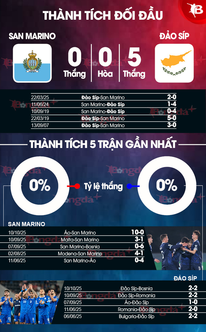 Tuy nhiên, ở vòng loại World Cup lần này, các đội bóng này đang áp đảo San Marino. Cách đây vài ngày, San Marino đã nhận thất bại tan nát... 0-10 trước Áo, hay trước đó là trận thua 0-6 trước Bosnia. Hiện tại, họ đang đứng cuối bảng với 0 điểm và chỉ ghi được 1 bàn thắng sau 6 vòng đấu nhưng đã để lọt lưới tới... 28 bàn. Vì vậy, ngay cả việc họ ghi bàn vào lưới Đảo Síp cũng có thể được coi là thành công.