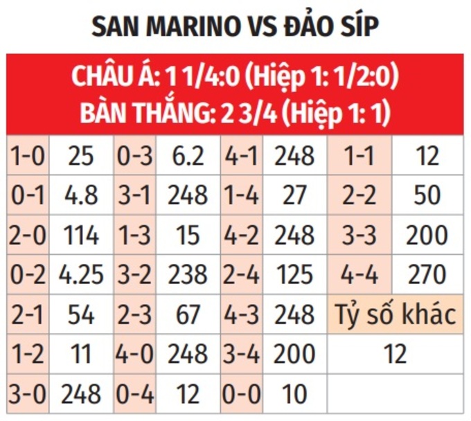 - Tối thiểu 2 bàn trong hiệp 1: 4/5 trận gần đây của San Marino cùng 5/6 trận vừa qua của Đảo Síp đều kết thúc hiệp 1 với tối thiểu 2 bàn thắng được ghi. 3/5 trận đối đầu gần nhất cũng có từ 2 bàn trở lên trước giờ nghỉ.