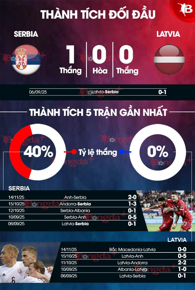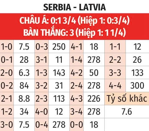 - Ít bàn thắng: Những trận đấu có sự góp mặt của Serbia thời gian qua thường diễn ra với thế trận rất chặt chẽ và kín kẽ, khi 9/12 trận gần đây đều có tối đa 2 bàn thắng được ghi. Với Latvia, các chân sút đội khách tịt ngòi 6/8 trận vừa qua, bao gồm thất bại tối thiểu ở trận lượt đi.