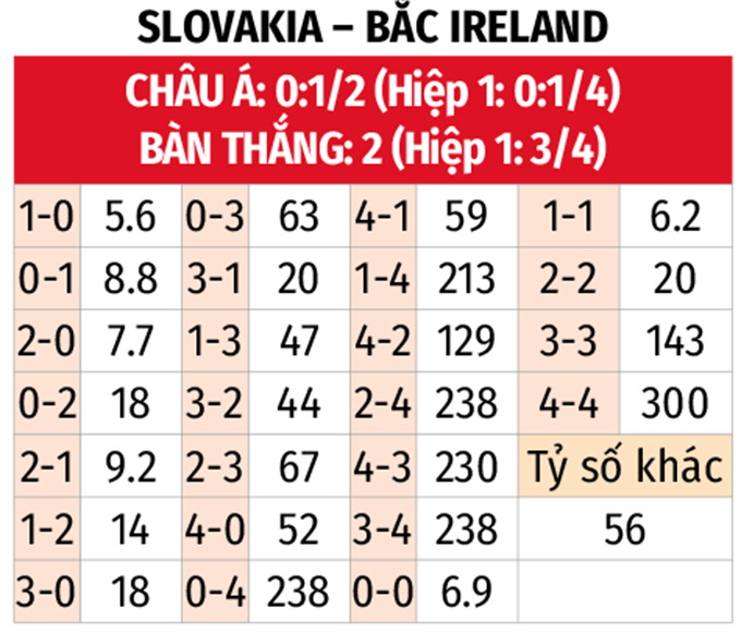 - Từ 4 góc trở lên trong hiệp 1: Lịch sử đối đầu giữa hai đội chứng kiến 2/3 trận đấu gần nhất kết thúc hiệp thi đấu đầu tiên với 5 tình huống đá phạt góc. Kịch bản nhiều góc trước giờ nghỉ hoàn toàn có thể tái diễn, khi các trận đấu gần đây chứng kiến hai đội khá tích cực "cày góc". Theo thống kê, 3/5 trận vừa qua của chủ nhà Slovakia cùng 7/10 trận gần đây của Bắc Ireland đều có tối thiểu 4 lần bóng được đặt ở bốn cột góc cuối sân trong hiệp đầu.