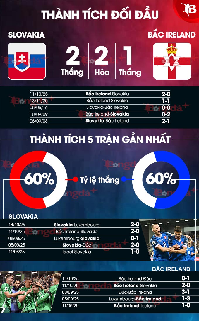 Trong khi đó, Bắc Ireland sẽ đến Bratislava sau trận thua có phần đáng tiếc trước Đức vào tháng trước. Bàn thắng trong hiệp một của Nick Woltemade đã tạo nên sự khác biệt tại Belfast. Lúc này Bắc Ireland vẫn đang cạnh tranh để giành quyền đi tiếp. Họ đang kém Slovakia 3 điểm. Trong bối cảnh còn trận đấu trên sân nhà cuối cùng gặp Luxembourg sắp tới, đội khách có thể hài lòng nếu tránh được thất bại, qua đó nắm bắt cơ hội ở vòng đấu cuối cùng vào tuần tới, khi Slovakia đối đầu Đức. Tuy nhiên, thành tích tệ hại trên sân khách, với 5/7 trận thua gần đây, khiến mục tiêu có điểm với họ là rất khó khăn.