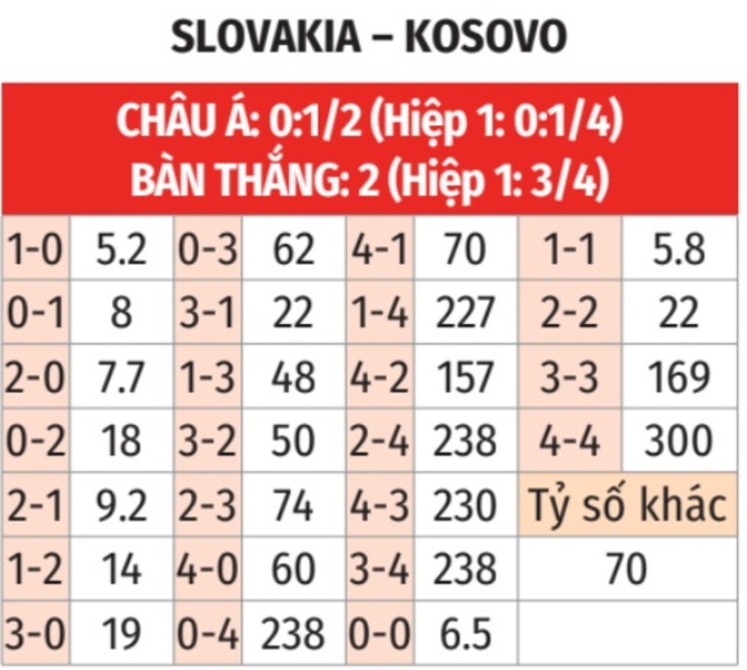 - Tối đa 2 bàn: 6/7 trận gần đây của Slovakia chỉ có tối đa 2 bàn thắng. Tình trạng tương tự xảy ra ở 5 trận vừa qua của Kosovo.