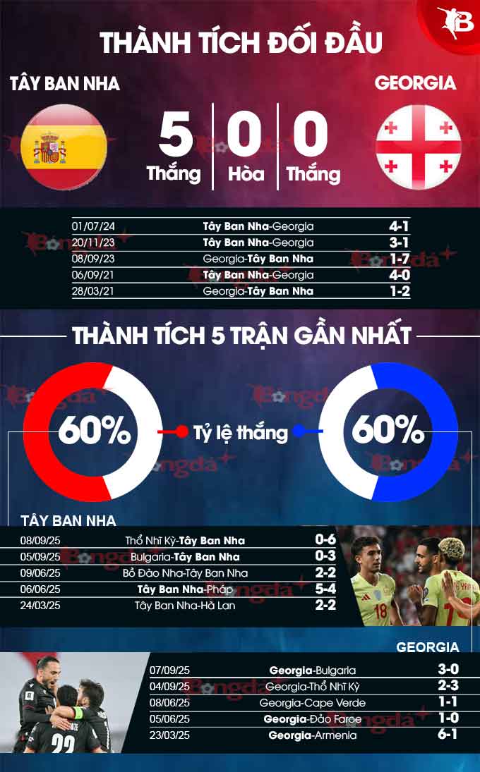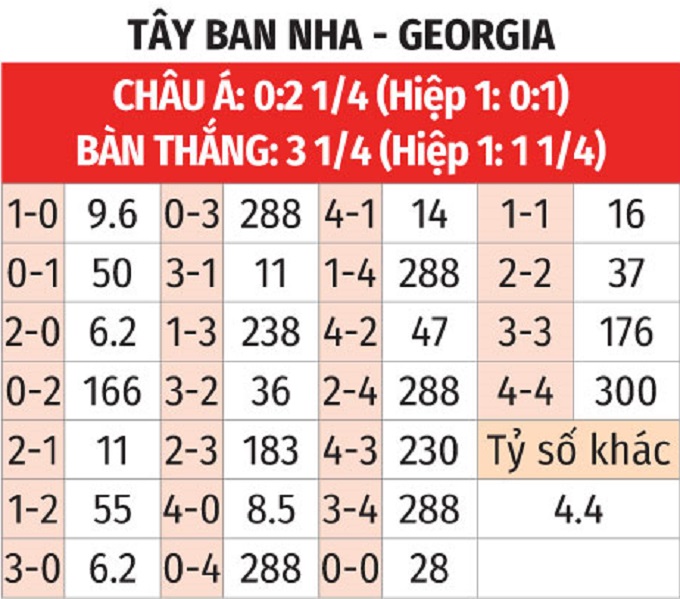 - Ít nhất 2 bàn hiệp 1: 5/6 trận gần đây của Tây Ban Nha đều xuất hiện tối thiểu 2 bàn thắng trong 45 phút đầu tiên. 5/7 trận vừa qua của Georgia cùng 4 trận đối đầu gần nhất cũng có từ 2 bàn trở lên trước giờ nghỉ.