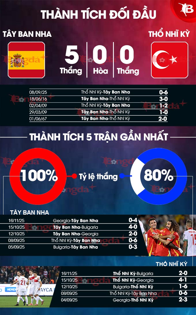 Lúc này, trong khi Tây Ban Nha toàn thắng 5 trận gần nhất thì Thổ Nhĩ Kỳ thắng 4/5 trận vừa xong. Tây Ban Nha có lợi thế sân nhà và đang có thành tích toàn thắng ở 15 trận vừa xong còn Thổ Nhĩ Kỳ thắng 4/5 trận sân khách chính thức gần đây.